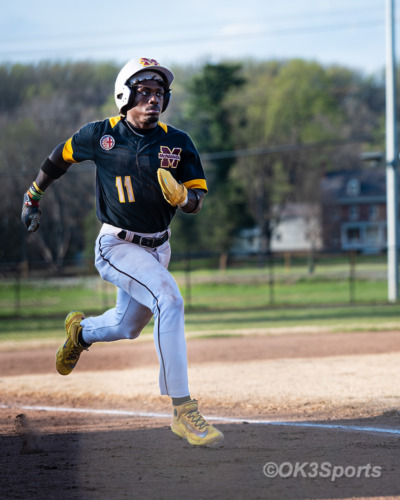 Forestville, MD — Ashton Strobridge (#11) of Bishop McNamara rounds third base and heads for home during a conference matchup against Our Lady of Good Counsel. Strobridge finished with three hits and two RBIs in the Mustangs’ 18-10 loss. Photo by Olen Kelley III/OK3Sports