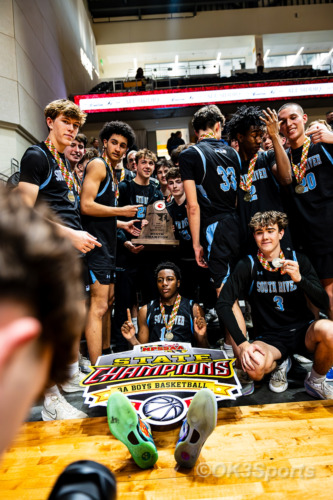 BALTIMORE, MD – March 17, 2026: South River players celebrate with the championship trophy after defeating Colonel Zadok Magruder 67-50 to win the MPSSAA 3A Boys Basketball State Championship at Chesapeake Employers Insurance Arena in Baltimore, Maryland. (Photo by OK3Sports)