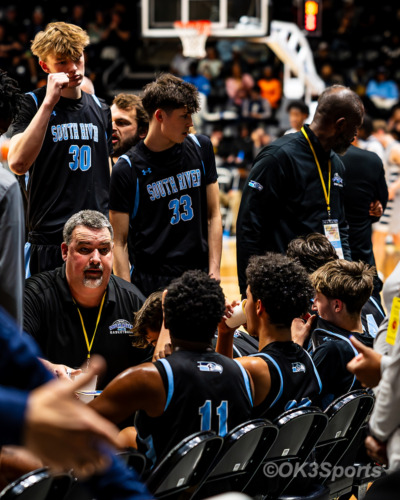 BALTIMORE, MD – March 17, 2026: South River head coach Darren Hall addresses his team during a second-half huddle against Colonel Zadok Magruder in the MPSSAA 3A Boys Basketball State Championship at Chesapeake Employers Insurance Arena in Baltimore, Maryland. South River defeated Magruder 67-50 to capture the program’s first state title. (Photo by OK3Sports/Olen Kelley III)