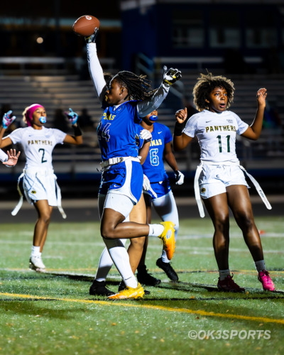 Kennedy Wyatt secures a long touchdown catch in the regional playoff during the high school flag football game featuring the Wise Lady Pumas and the Parkdale Lady Panthers on Tuesday, November 04, 2025, at The Den in Upper Marlboro, MD. Photo: OK3Sports/Olen Kelley III